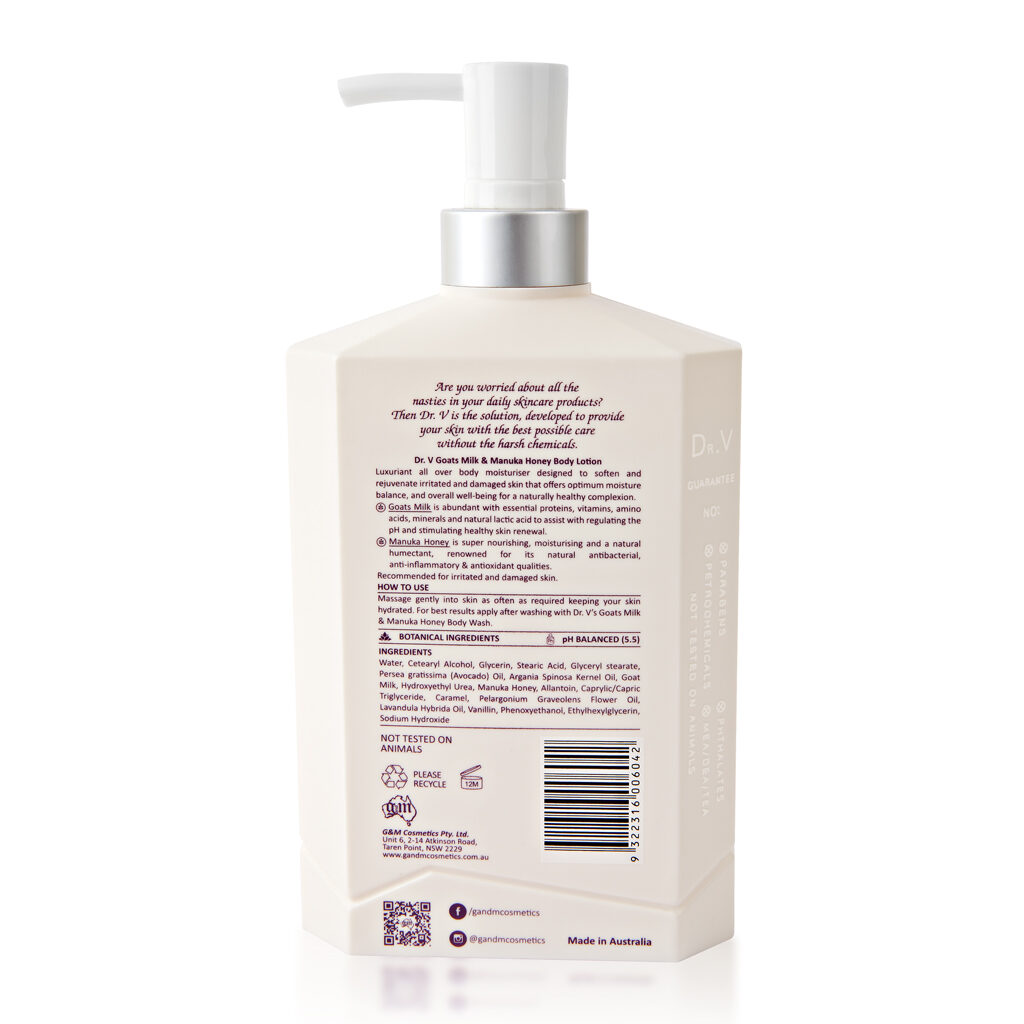 Dr. V Goats Milk & Manuka Honey Proactive Body Lotion is a luxuriant all over body moisturiser. Specially formulated to soften & rejuvenate irritated, damaged skin. Dr. V Goats Milk & Manuka Honey Proactive Body Lotion provides optimum moisture balance & overall well-being for a naturally healthy complexion.