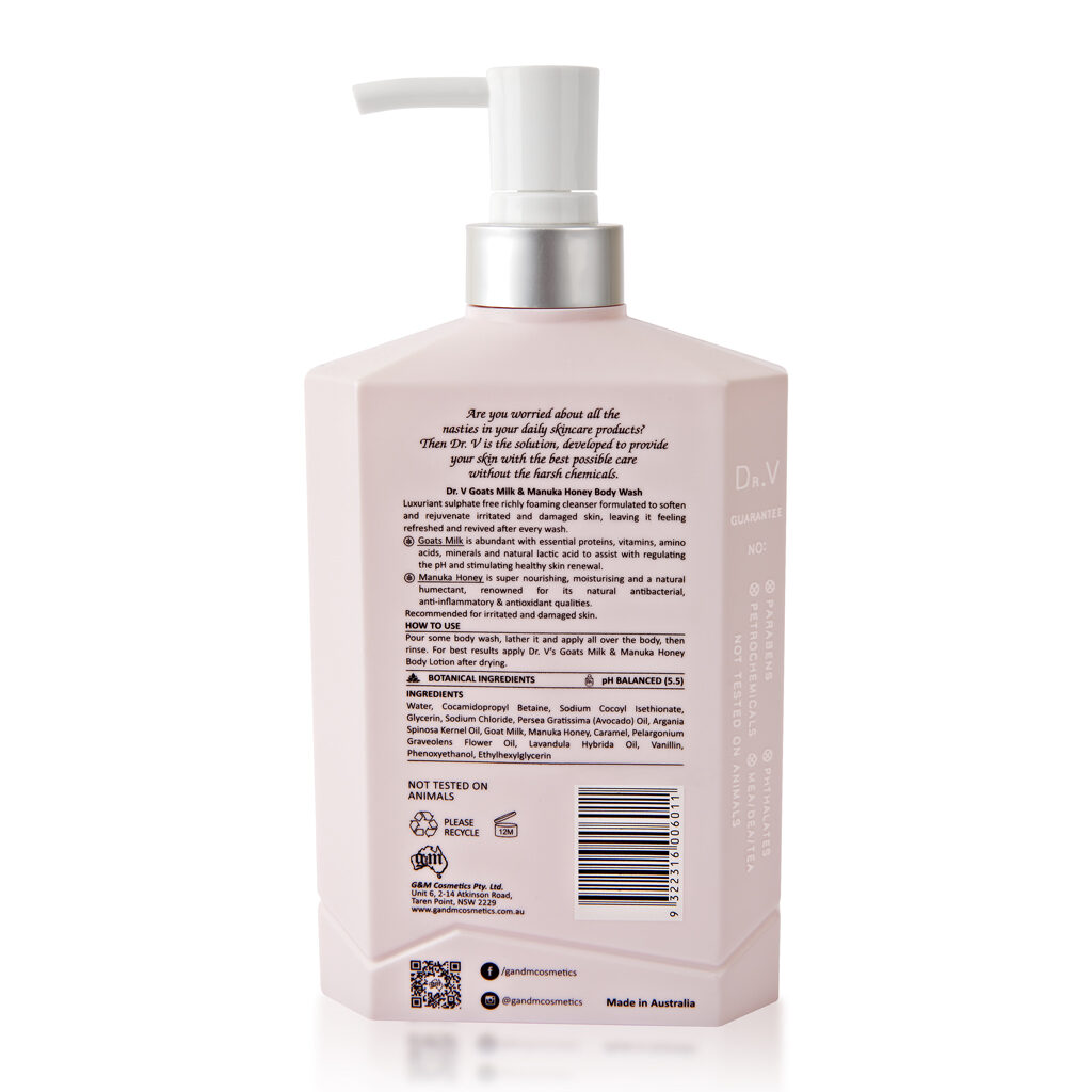 Dr. V Goats Milk & Manuka Honey Proactive Body Wash is a luxuriant sulphate free richly foaming cleanser formulated to soften & rejuvenate irritated skin, leaving skin feeling refreshed & revived after every wash.